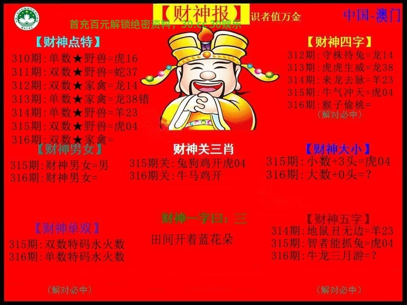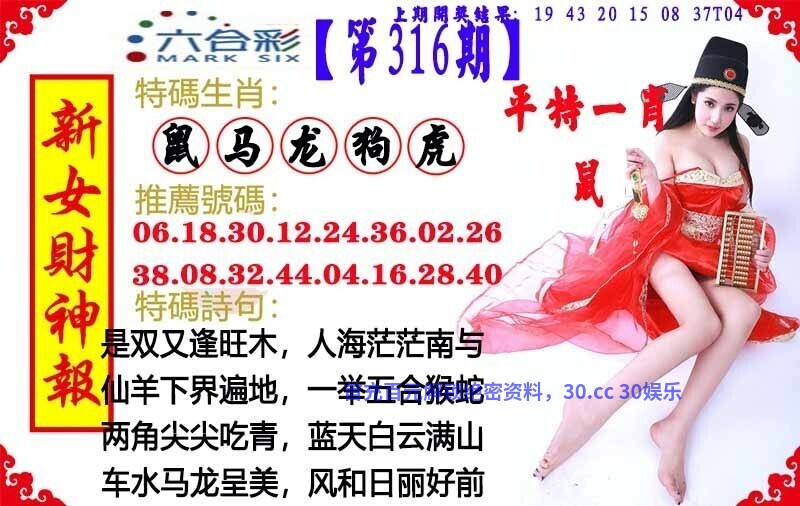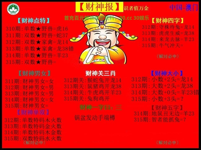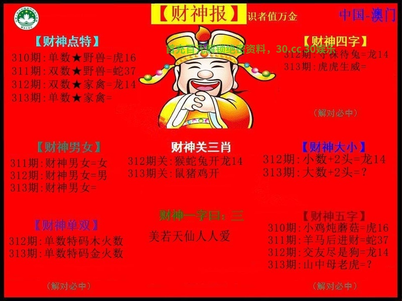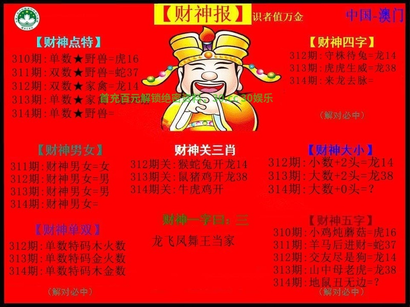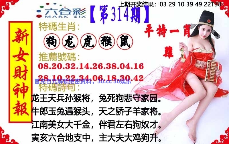 314期六合财神解诗句: 龙王天兵孙猴将,兔死狗悲守家园 牛郎玉兔遇猴头,天之骄子羊家将 江南美女大千金,伴君左右狗奴才 寅亥六合地支中,主大夫大鸡狗升 主特八肖:狗龙虎猴鼠鸡羊蛇 |